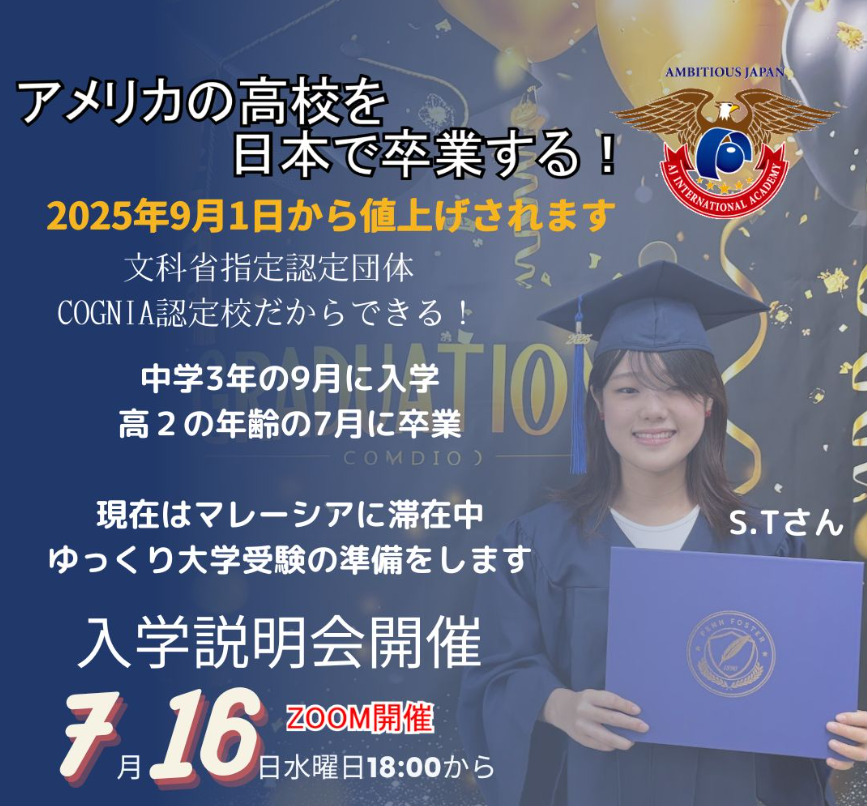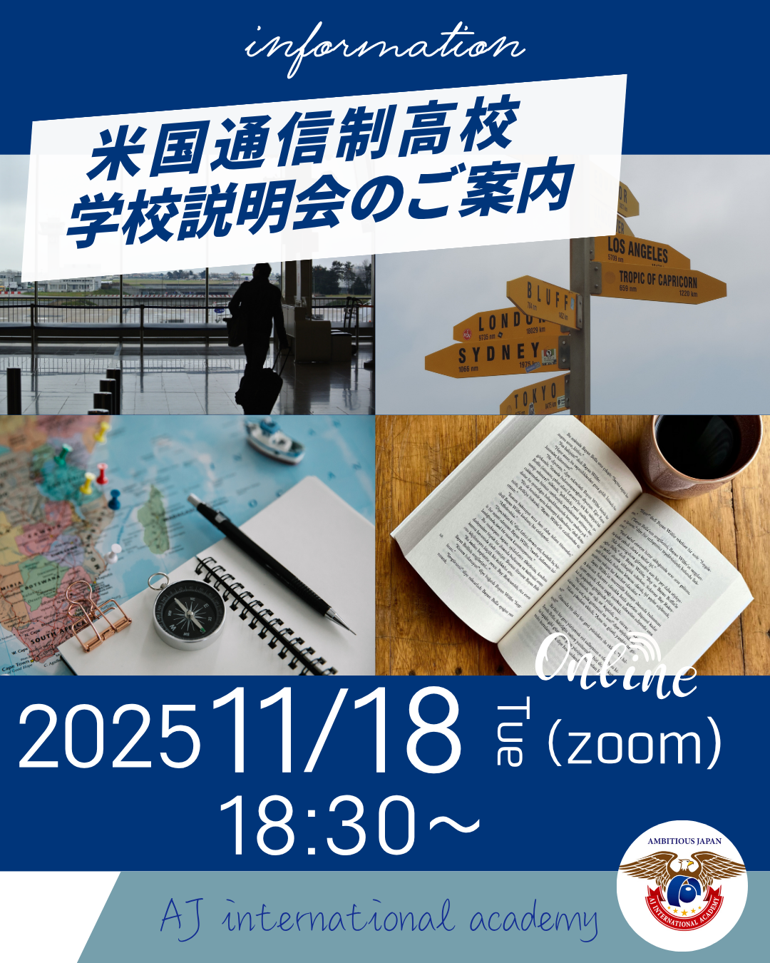 11月18日(火)米国通信制高校学校説明会 2025年11月19日2025年11月21日 説明会 前編 後編 日米ダブルディプロマ ―― 世界へ続く学… Bridge Builders Award授賞式 2025年11月14日2025年11月14日 授賞者と受賞作品はこちら Bridge Builders A… 学校説明会を開催します(終了) 2025年11月7日2025年11月21日 学校説明会 を開催します! 米国通信制高校(終了しました) … AJ発・学びの自由を語る2冊、刊行! 2025年10月27日2025年11月19日 「日米ダブルディプロマ」と「ペンフォスター高校」出版のお知ら… Bridge Builders Awardファイナリスト 2025年10月20日2025年10月20日 未来共創プロジェクト・君が紡ぐ未来 NPO留学協会主催第一回… 学費改定のお知らせ 2025年8月27日2025年8月27日 学費改定のお知らせ 2025年9月1日より、アメリカのパスポ… 夏季休業 2025年8月8日2025年8月8日 平素は格別のご愛顧を賜わり、厚くお礼申しあげます。 誠に勝手… “Bridge Builders Award”開催! 2025年8月8日2025年8月8日 未来共創プロジェクト・君が紡ぐ未来 NPO留学協会主催第一回… アメリカへバスケ留学に出発 2025年7月30日2025年7月30日 松尾理史(まつお りひと)くん、15歳。 8月3日、アメリカ… 説明会収録動画(7/16) 2025年7月19日2025年7月30日 米国通信制高校学校説明会 収録動画 このたびは、米国通信制高…