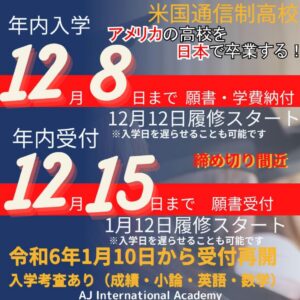 2023年12月5日 / 最終更新日時 : 2023年12月5日 InternationalAJ お知らせ 高校3年生で、中退 高校3年生で、中退。 結構多くいらっしゃいます。 コロナ禍で生活が不規則になったり、先の見えない社会に精神的に不安定になったり、その理由は様々。 でも、大丈夫。高校3年生までがんばって取った単位は、アメリカの通信制高校にも置換できます。 がんばれば、数か月で卒業も可能。進路が見えてきます。 年内の入学は12月8日まで。 年内の受付(年明け以降の入学)は12月15日までです。