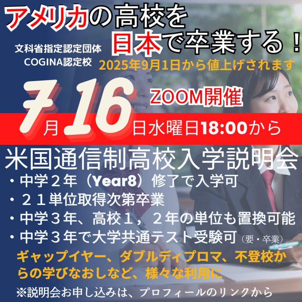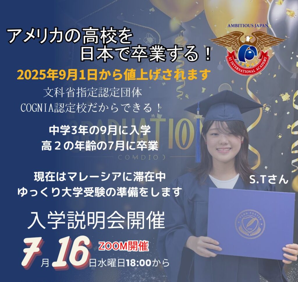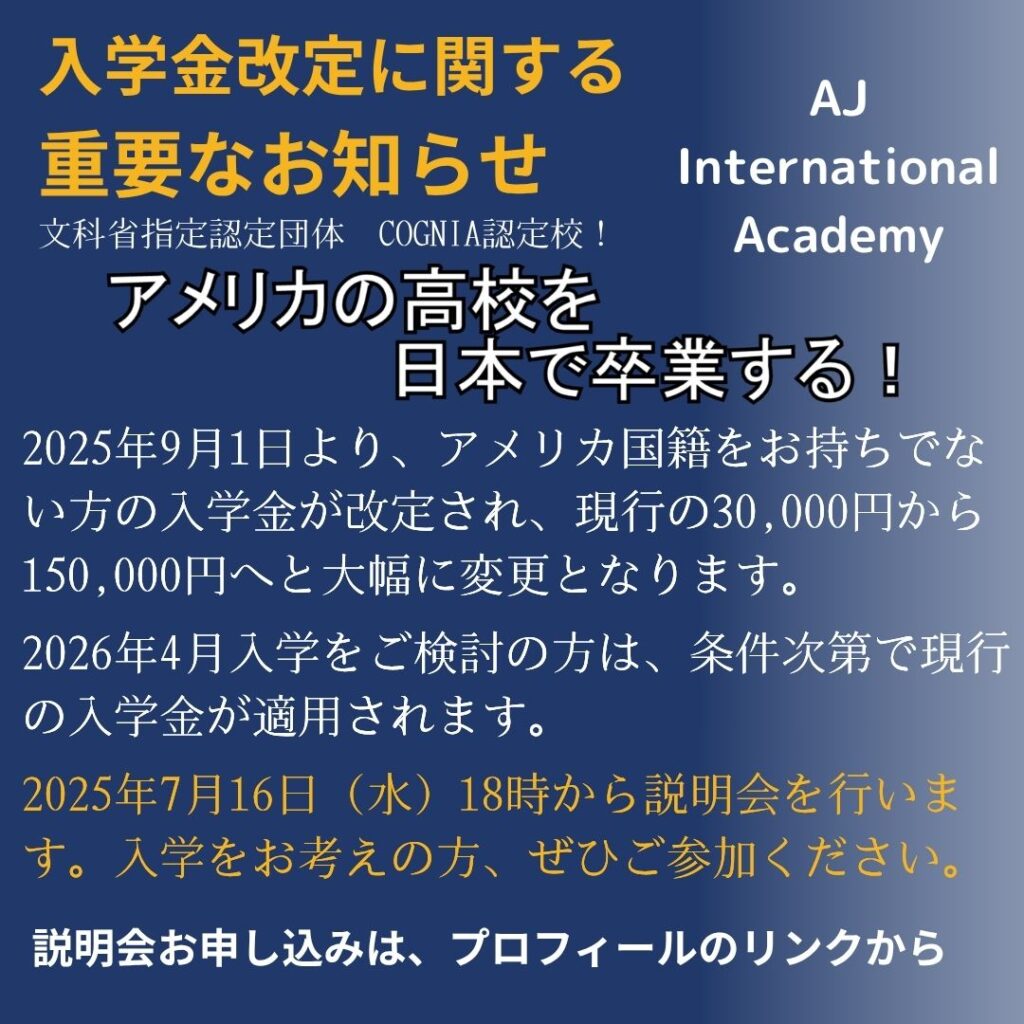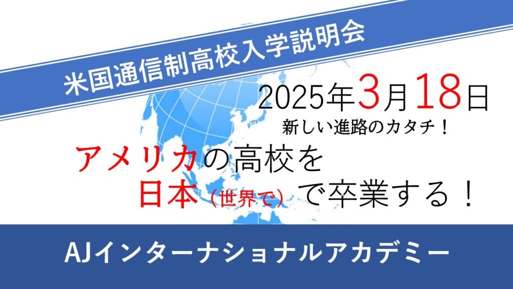 投稿一覧 学校説明会 中学3年生で入学したSちゃん。 Read more 米国通信制高校学校説明会 「以前この場でご紹介した、佐賀 Read more ペンフォスター高校説明会 「知恵袋」や一部の情報サイトで Read more 米国通信制高校 学校説明会 来る7月16日(水曜日)18時 Read more 入学金金改定 2025年9月1日から、アメリ Read more COGNIA認定校-大学受験資格 AJインターナショナルアカデミ Read more 数学プレイスメントテスト対策 数学プレイスメントテスト対策& Read more 中学基礎英語-収録完了 中学1年生からのオンラインライ Read more duolingo English Tes... 近年、MITやハーバード大学な Read more バスケ留学 一時帰国 2021年にAJに入会し、現在 Read more 説明会ご参加ありがとうございました 米国通信制高校入 Read more 米国通信制高校 説明会(3/18) 「米国通信制高校入学説明会」を Read more « Previous 1 2 3 4 … 11 Next »