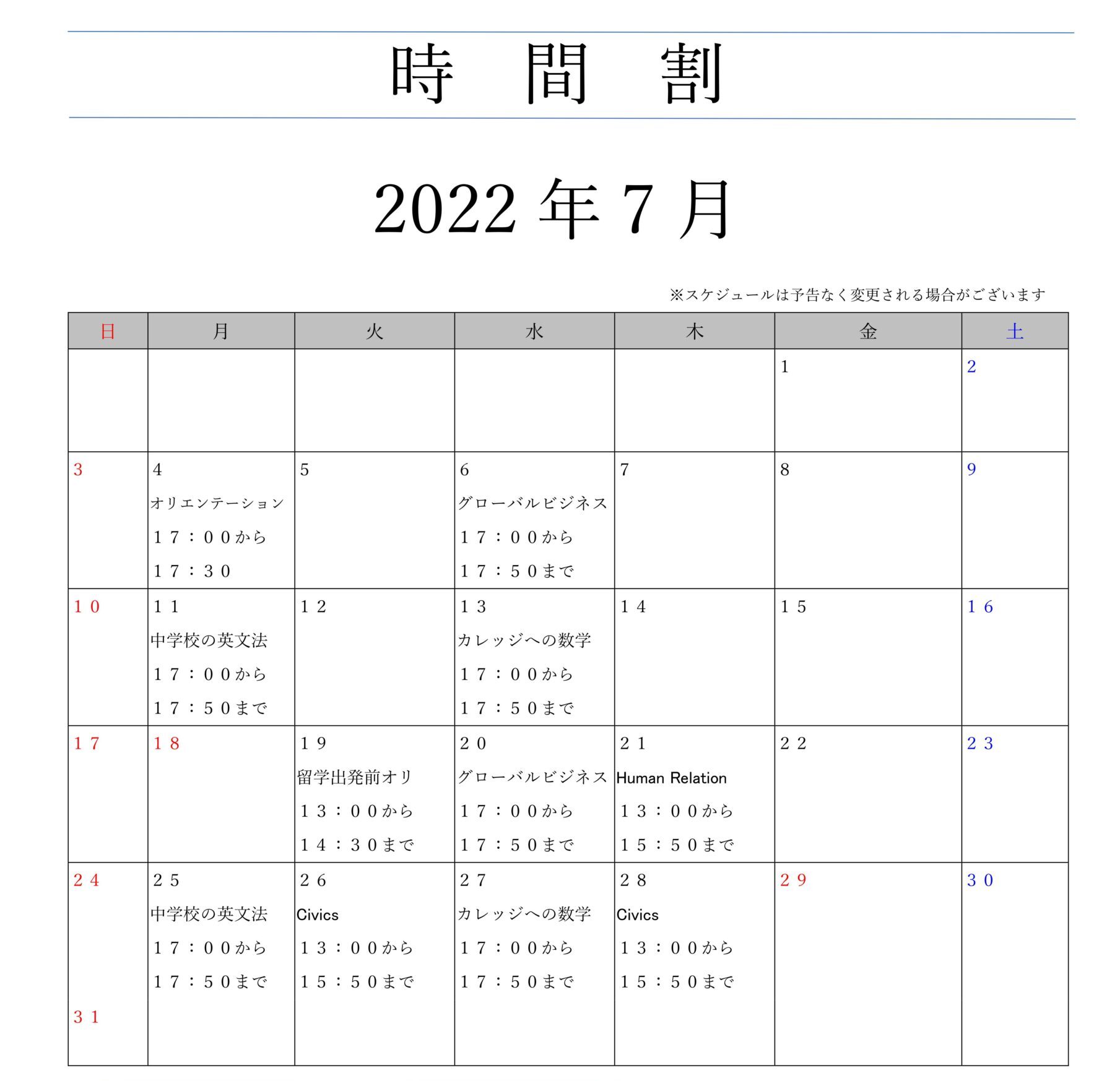 日本の学校では深く習わない、「人間関係学」「米国社会学」「米国の歴史」の授業を、集中して行います。1回約3時間という長丁場ですが、ぜひこの機会に知識を深めてください。米国通信制高校プログラムの受講生は、単位に直結する授業となりますので、出来る限りご参加ください。留学準備講座の受講生も、アメリカのカレッジでは必ず履修する分野ですので、受講することをお薦めいたします。 ※50分ごとに10分間の休憩を取ります。 |