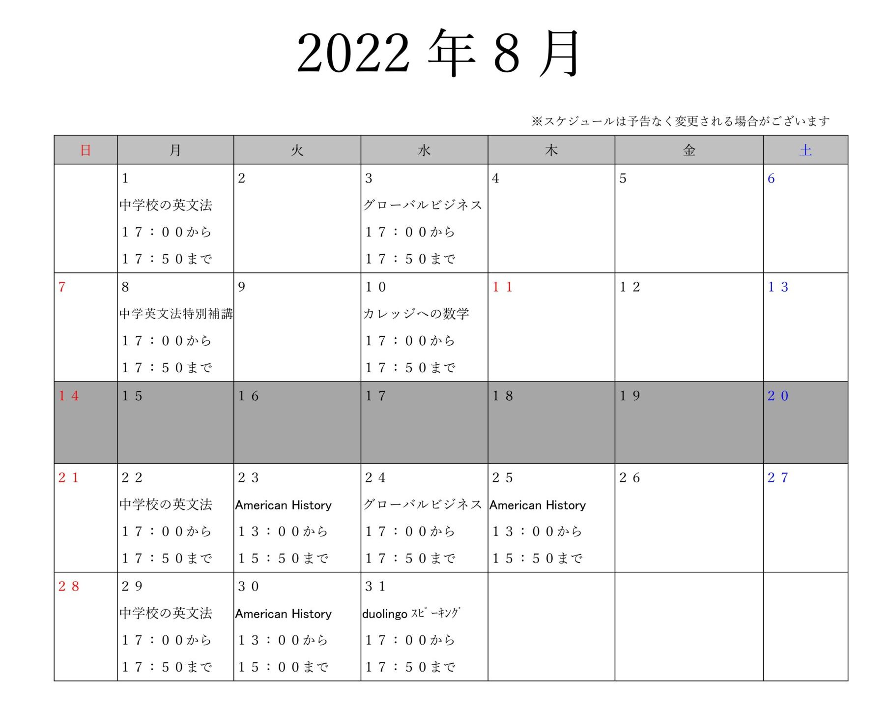 米国高校生用特別夏期講習