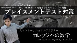 カレッジ留学間近の方は、ぜひ受講してください。現地で受ける数学の実力テスト(Accuplacer Test, TSI, ALEKSなど)の対策講座です。各テストの出題方法や、傾向などを解説していきます。日本の高校では習わない箇所も出題されていますので、難易度は高めの内容ですが、中学生も今のうちに聞いておくだけでも、将来役に立ちます。繰り返しますが、留学出発間近の方は、必ず受講してください!留学の成功には、英語力ばかりでなく、数学力も必要です。 |